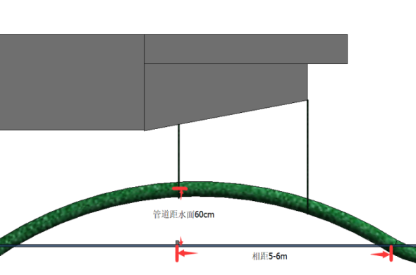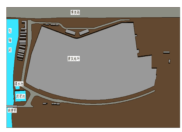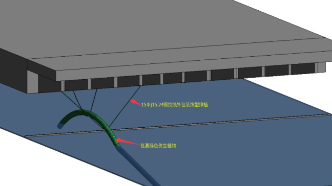 在超远距离土方运输方案中,部分输浆管道途经河闸,将采用四根15φj15.24的钢绞线分别固定在桥头拱肋处将管道吊至半空(离河面60cm左右,两端超出6m左右),外包具有装饰作用的仿绿植材料进行保护,保证管道的美观度,钢丝绳采用具有装饰作用的绿色仿生材料进行保护。通过模型可直观反映输浆管途径河闸时的布置情况;